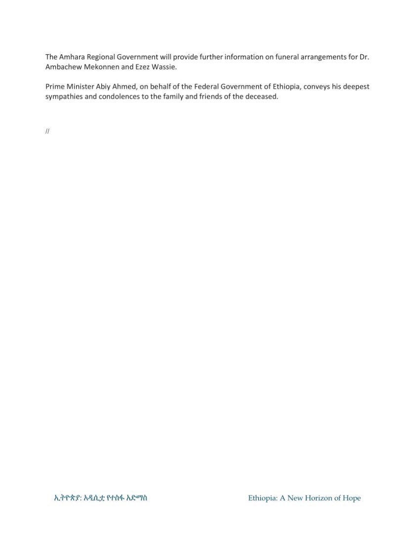 Horndiplomat-Official confirmation from Ethiopia PM’s office on the death of Amhara region president and chief of staff of national army. Statement says the shooting death of the army chief and another retired general was related to the coup attempt.