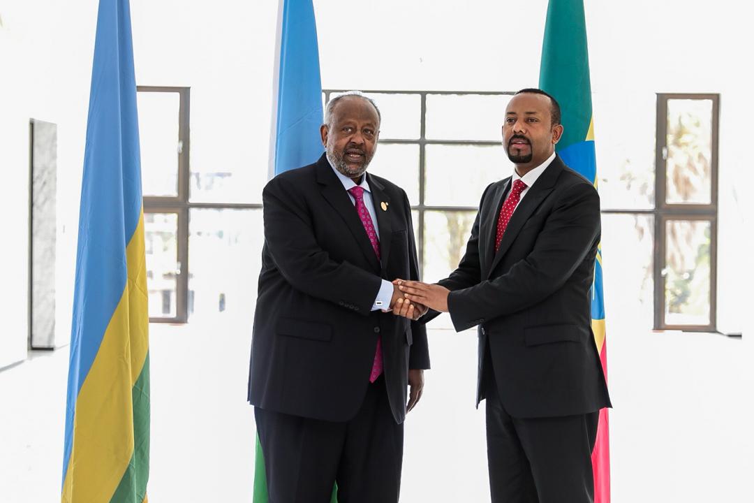 Ethiopian Prime Minister Abiy Ahmed shakes hands Djibouti President Ismaïl Omar Guelleh