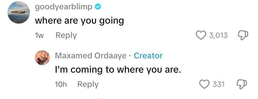 Ordaaye also received an unexpected comment from the verified account of the Goodyear Blimp, part of the fleet of commercial airships operated by the Goodyear Tire and Rubber Company.