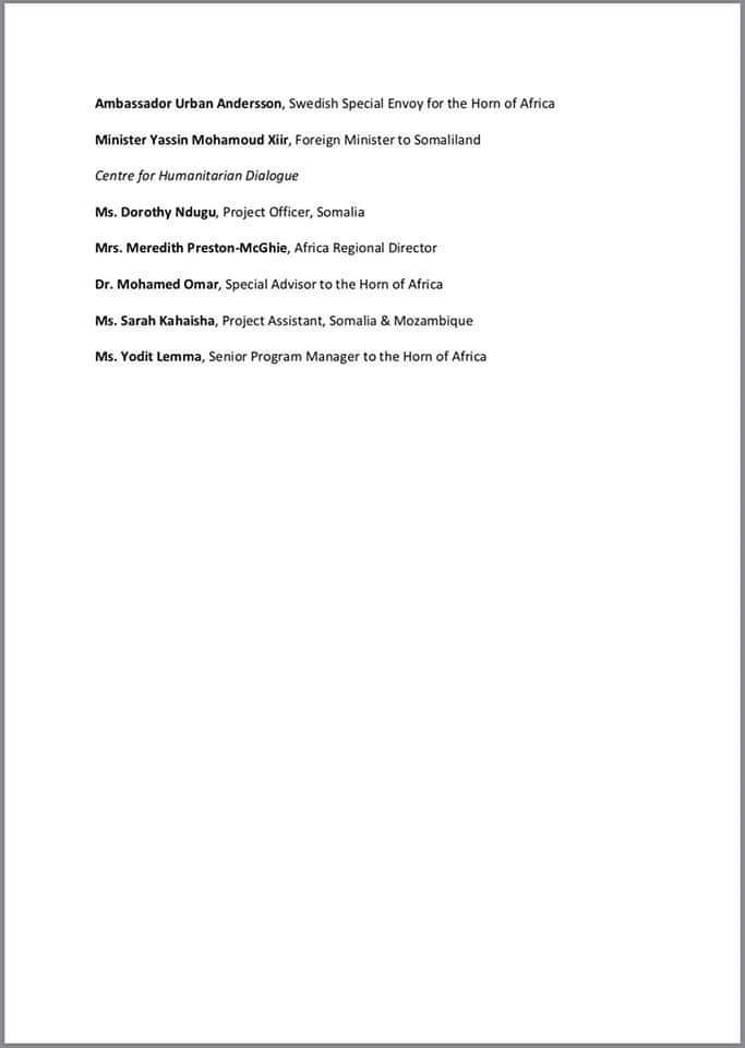 Somaliland the listed participants include the Minister of Foreign Affairs and International Cooperation Yasin Hagi Mohamoud Hiir (Faratoon), Somaliland’s Representative to Kenya, Mr. Bashe Omar and the Director of Civil Aviation Captain Abdi Rodol.