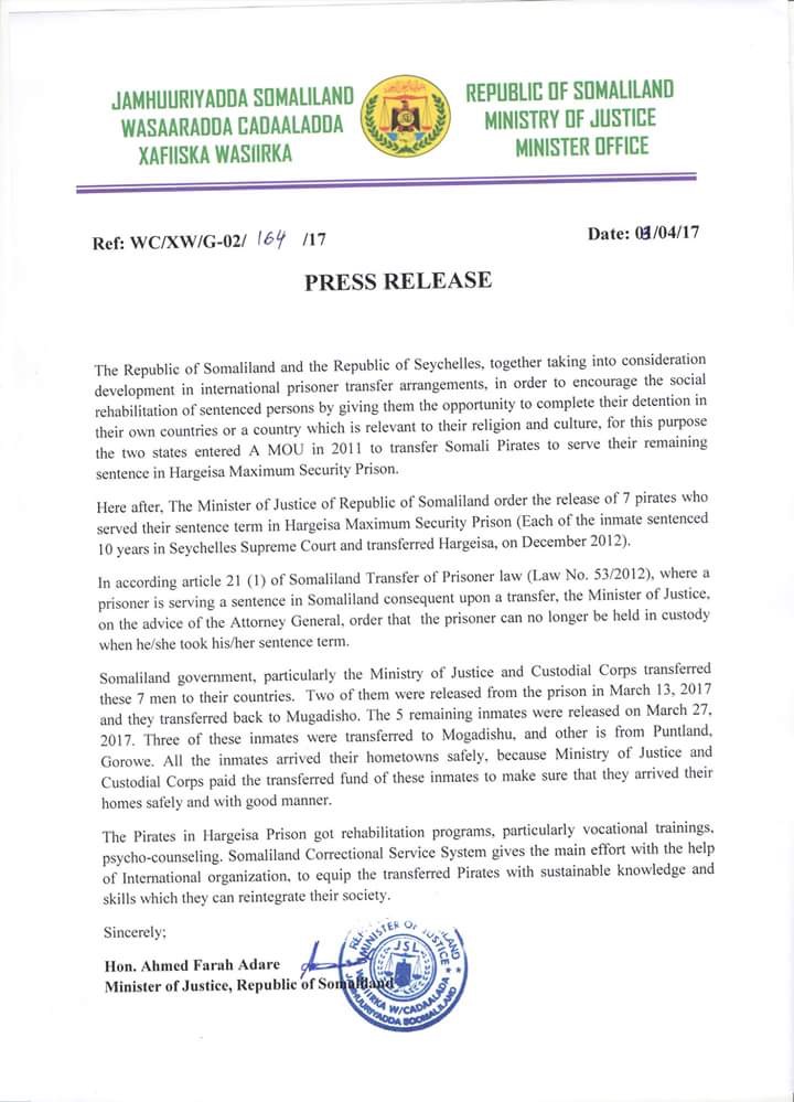 Here after, The Minister of Justice of Republic of Somaliland order the release of 7 pirates who served their sentence term in Hargeisa Maxium Security Prison (Each of the inmate sentenced 10 years in Seychelles Supreme Court and transferred Hargeisa, on December 2012).