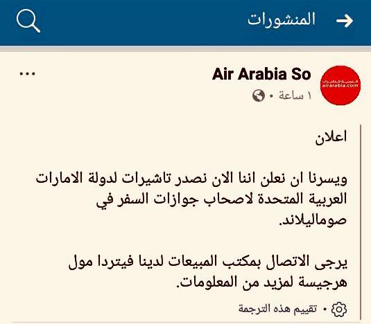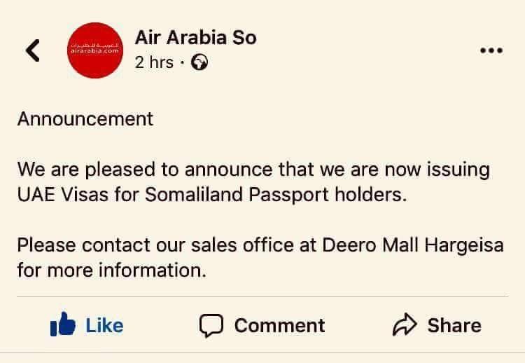 “We are pleased to announce that we are now issuing UAE Visas for Somaliland Passport holders.Please contact our sales office at Deero Mall Hargeisa for more information.”Air Arabia So.