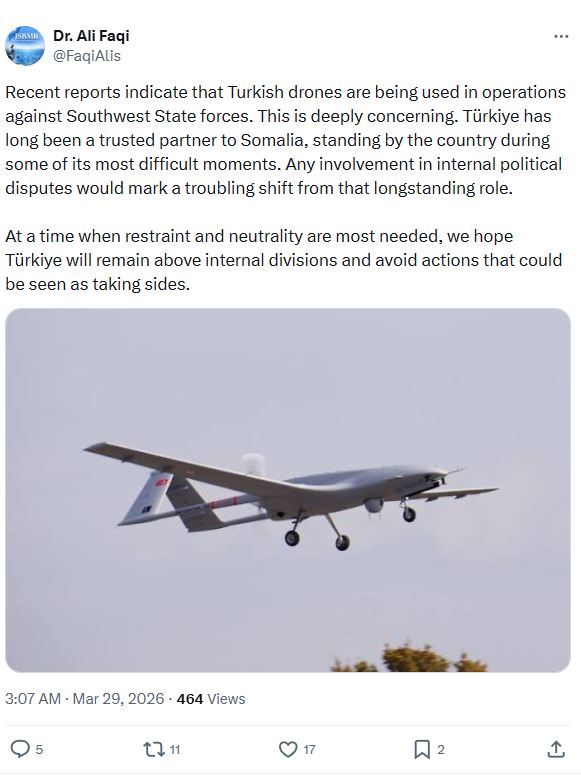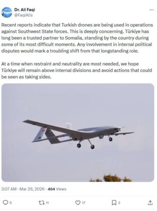 Separately, Ali Said Fiqi, chairman of the Southwest State parliament, said reports of Turkish drone use in operations against regional forces were “deeply concerning,” adding that Türkiye had long been a trusted partner to Somalia.