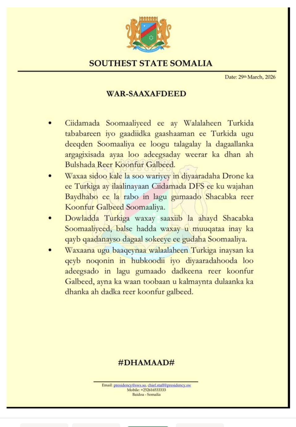Southwest authorities further alleged that federal officials coordinating with Türkiye had indicated plans to detain regional leader Abdiaziz Hassan Mohamed “Laftagareen,” potentially using Somali special forces and Turkish-supported military assets.